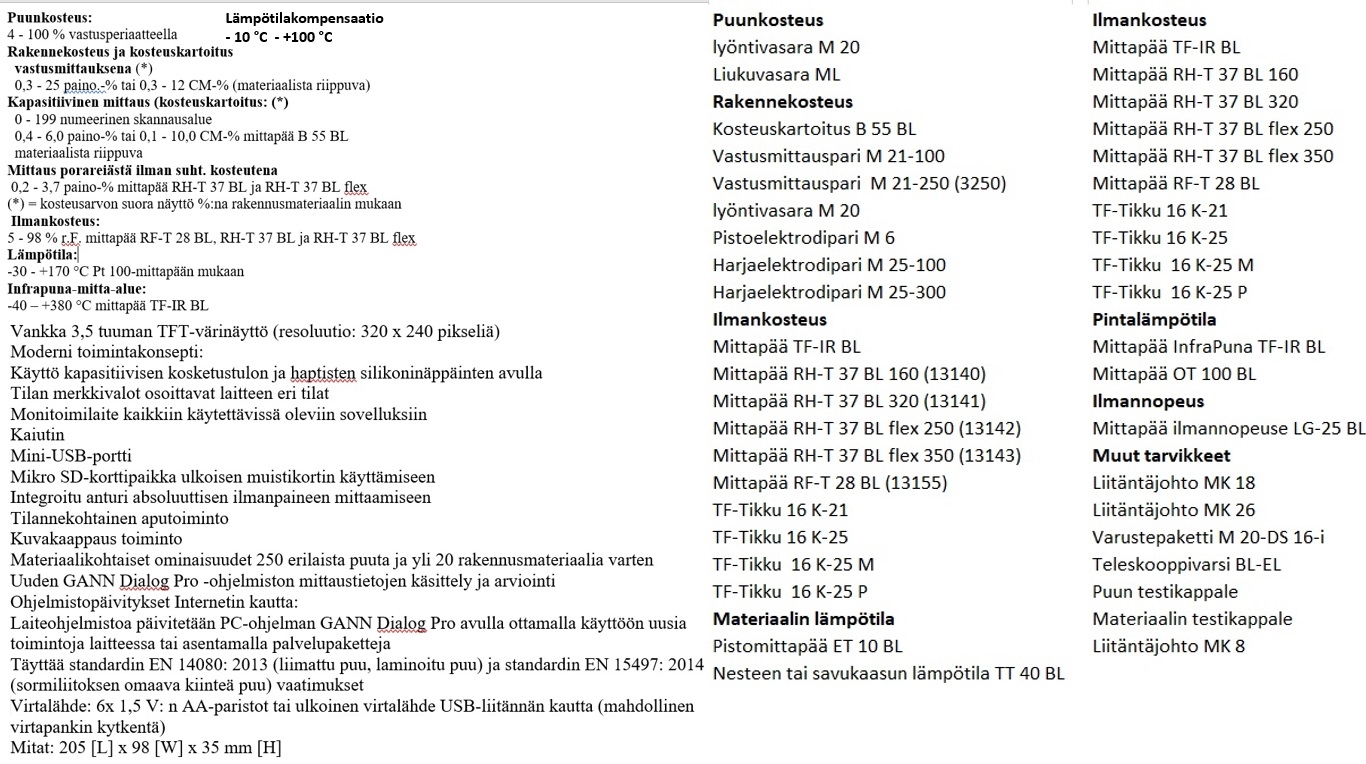 - Puukosteus mitataan vastusmenetelmällä tarkasti, rakenteita voidaan kartoittaa ei-invasiivisesti kapasitiivisesti, ja pienten ilmavirtojen mittaus onnistuu LG‑25 BL -anturilla.