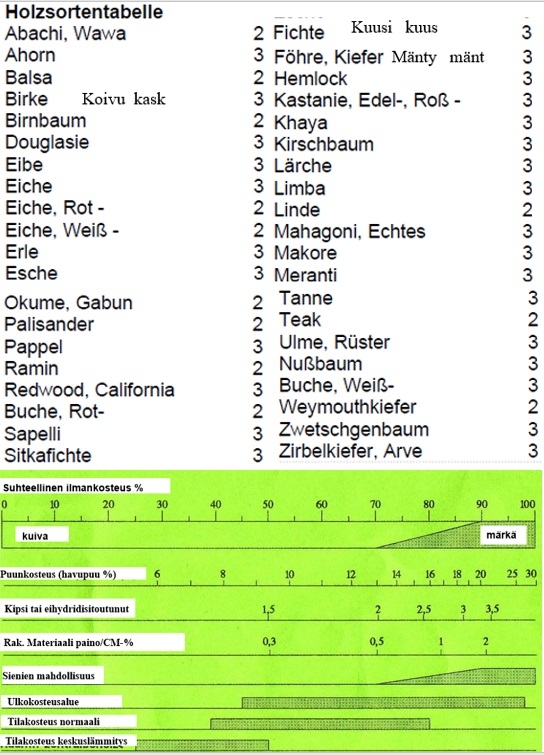 - Huom. Puunkosteudenmittatulokset on luettavissa lämpötila-alueella 15 – 25 ºC suoraan näytöltä. Ko lämpötilan ulkopuolella on poikkeama suurempi. Kohdetta ei pidä mitata metallin päällä ja viiluja mitattaessa tulee olla useampi viilu toistensa päällä.